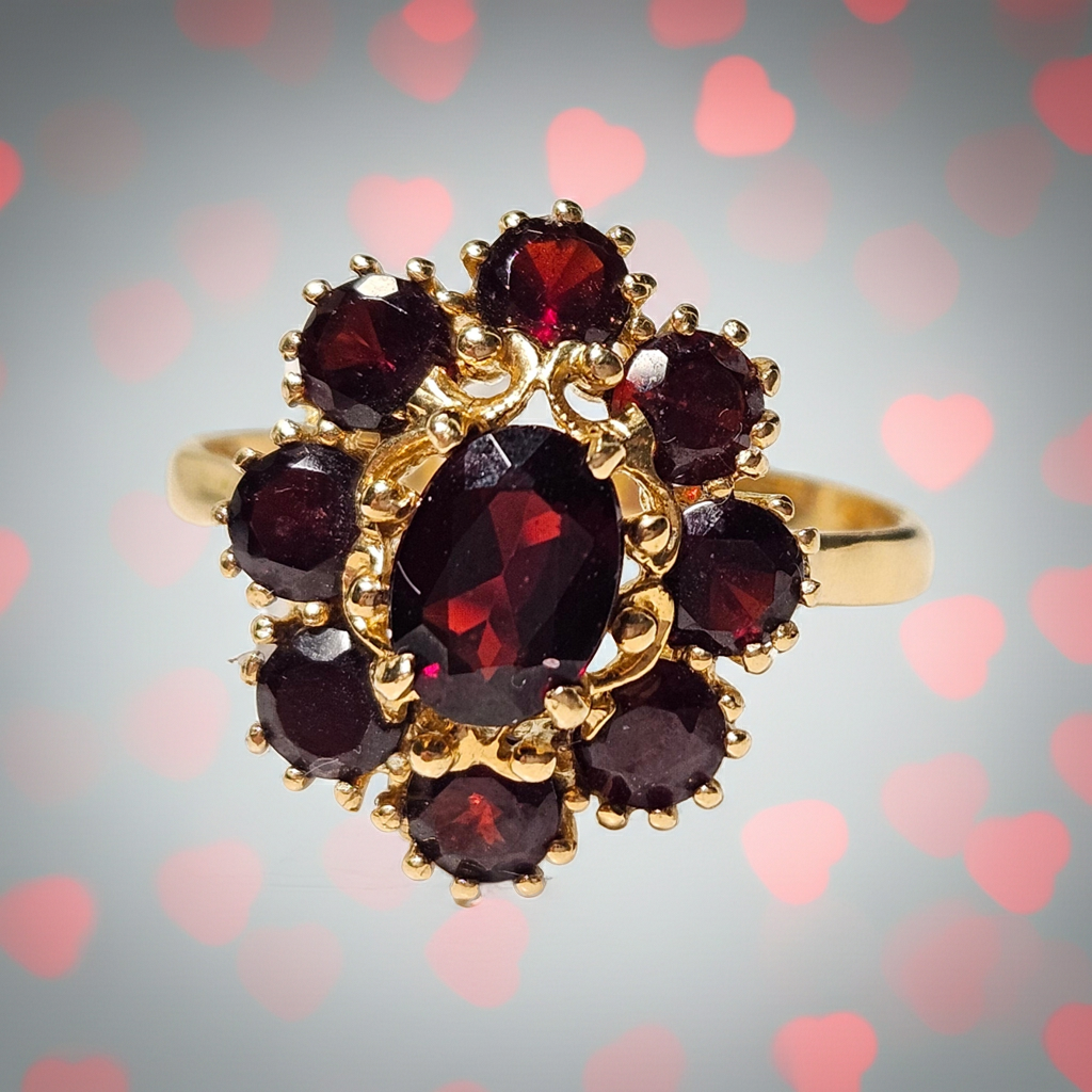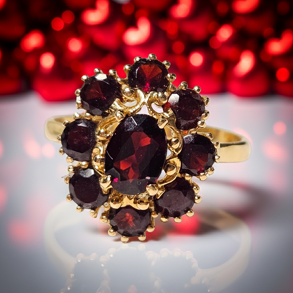 Indulge in the luxurious allure of this 18kt yellow gold garnet cluster ring, where deep crimson stones create an irresistible focal point that demands attention. The rich gold setting perfectly enhances the garnets' natural warmth, creating a piece that flatters every skin tone and makes your hand look absolutely stunning. This isn't just jewelry—it's an investment in timeless elegance that elevates everything from casual denim to evening attire. Why settle for ordinary accessories when you can own this extraordinary statement piece that radiates confidence and sophisticated taste with every gesture?